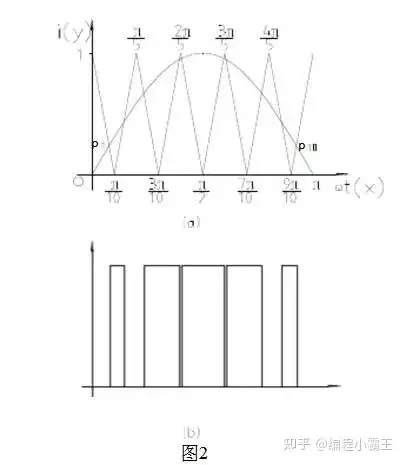 自然采样法是一种基于面积等效理念的能量转换形式,其原理极为简单而且直观,并具备十分确切的数理依据,通用性及可操作性也很强。当正弦基波与若千个等幅的三角载波在时间轴上相遇时,并令正弦波的零点与三角波的峰点处于同相位(图2a),所得的交点(p)表达为时间意义上的相位角和对应的瞬时幅值,交点间的相位区间段表示以正弦部分为有效输出的矩形脉冲群(图2b)。