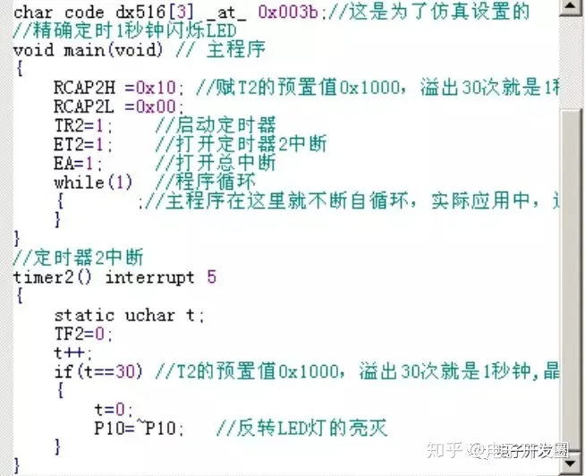 我们在定时器服务函数里,设置了一个静态变量t,静态变量的值在进入函数时是不会被初始化的,而是保持上次的值。它用来计数定时器的溢出次数,也就是 T2 中断函数进入的次数,每溢出 30 次,就控制一次 LED 的反转显示。这时的时间就正好是 1 秒,而且是精确的 1 秒!只与晶振的精度有关。