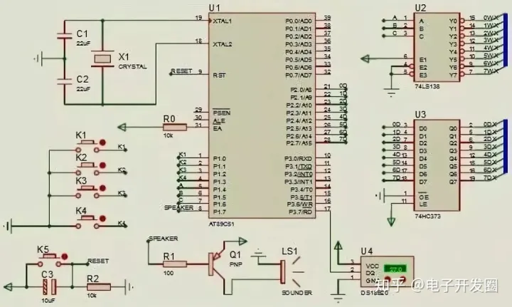 上图为时钟电路的原理图。分为最小单片机系统、单片机复位电路、按键电路、数码管位选电路、数码管段选电路、数码管显示电路、蜂鸣器电路、温度采集电路。