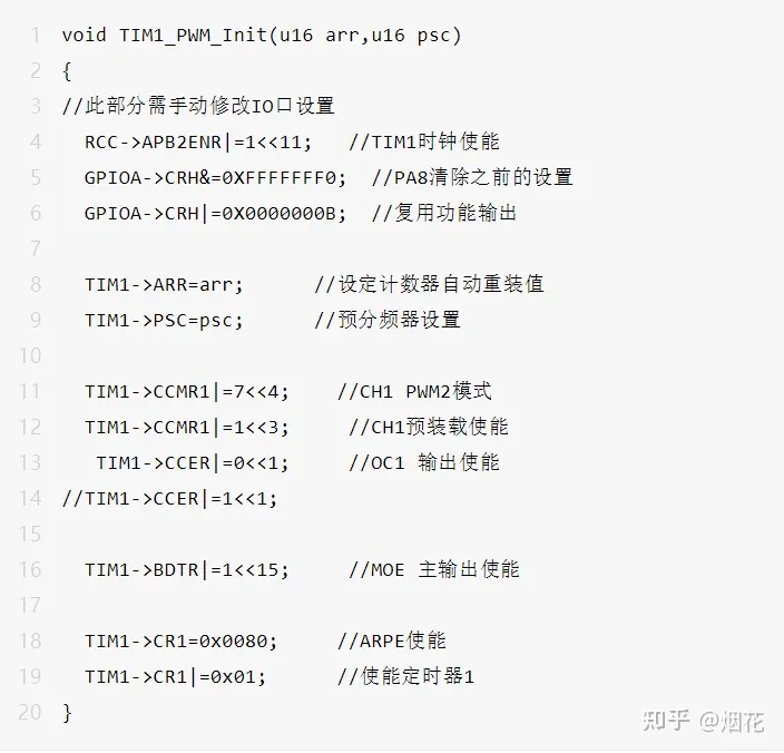 这三行是用来设置PWM输出模式和设置通道的,通道是什么呢?简单地讲就是输出PWM波的GPIO口,代码一开始不是设置了PA8这个GPIO口嘛,这个PA8就是通道1。使用通道的话要先进行输入输出方向、通道使能的设置。