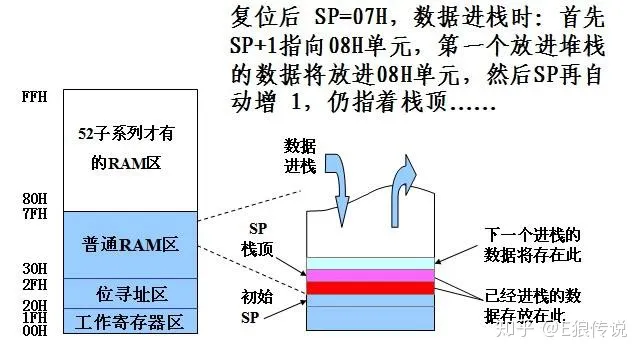 我们一般说的堆栈指的栈。堆栈又分硬堆栈和软堆栈,硬堆栈即SP,从片内RAM的顶部向下生长。软堆栈在硬堆栈跟全局变量区之间的空间,C51函数调用通过R0-R7和栈来实现。