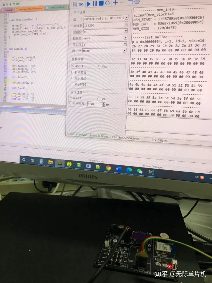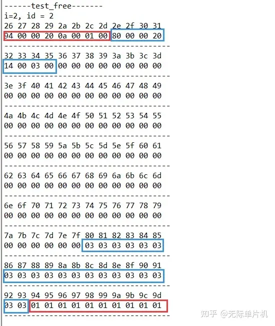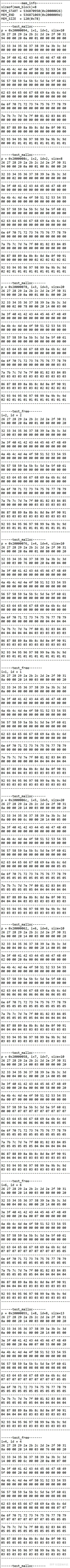 密密麻麻的数据上一行是地址,为了方便调试和显示,我限制了最大只能分配120个字节,然后地址一个字节够用,就把高3个字节地址去掉了。