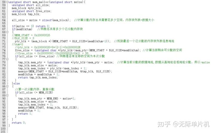 mem_malloc()函数就是以上面说的分配原理,然后用代码去实现,源代码如下: