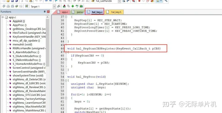 把KeyEventHandle这个函数的地址赋值给hal_key.c的KeyScanCBS这个函数指针。