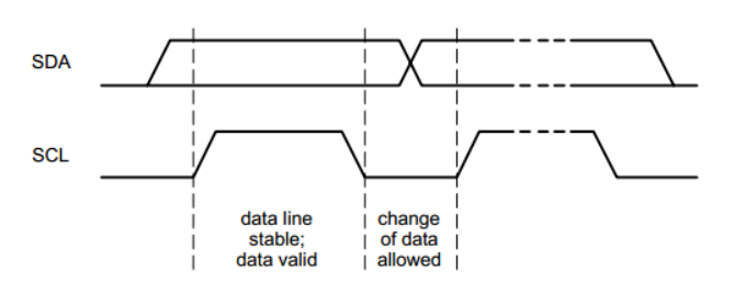 SDA线置为高电平代表1,置为低电平代表0,在从机进行数据采样之前,SCL被置于低电位,而在采样时,SCL线拉高,此时SDA线就不允许切换电平了,它处在什么电平就决定了从机读到的数据是0还是1。而当SCL线被拉回低电位的时候,SDA线既可以切换电平,也可以保持不变,为下一比特信息的传输作准备。