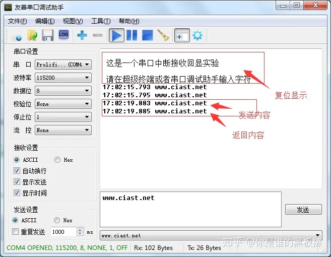目前使用了UART的两个中断USART_IT_RXNE(接收缓存补空中断)和USART_IT_TXE(发送缓存空中断),前一个中断保证了一旦有数据接收到就进入中断以接收特定长度的数据,后一个中断表示一旦发完一个数据就进入中断函数,保证连续发送一段数据。一个设备的所有中断都包含在一个中断服务程序中,因此必须首先分清楚这次响应的是哪一个中断,使用USART_GetITStatus()函数确定;采用USART_ReceiveData()函数接收一个字节数据,采用USART_SendData()函数发送一个字节数据,当关闭中断时采用USART_ITConfig()失能响应的中断。实例程序: