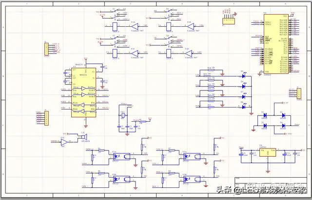 while(abs(TimerCnt1Ms-LastTime1Ms) TimerCnt1Ms=0; } // Timer0 overflow IntNum=10 void timer1_ovf_isr(void) interrupt 3 { unsigned char Second,Minute,Hour = 0; TimerCnt1Ms++; if( TimerCnt1Ms==1000 )//1秒 { TimerCnt1Ms = 0; Second++; if( Second==60 ) { Second = 0; Minute++; if( Minute==60 ) { Minute = 0; Hour++; } } } } void sendchar() { char i; sc[2]=0x0d; if ((Flag&0x0f)>9) sc[0]=65+(Flag&0x0f)-0x0a; else sc[0]=48+(Flag&0x0f); if((Flag&0xf0)>0x90) sc[1]=65+((Flag>>4)&0x0f)-0x0a; else sc[1]=48+((Flag&0xf0)>>4); for (i=0;i<=2;i++) { SBUF=sc[i]; // while (!(USR & 0x40)) { } // USR|=0x40; } } void checkpinc(char c) //C端口检测 { int DelayNum=0; Delay(30); counter=0; do { Delay(2); DelayNum++; // if (PINC&c==c) counter++; } while( DelayNum<15); if (counter>10) Flag |=c; } void checkpind(char d) //D端口检测 { int DelayNum=0; counter=0; do { Delay(2); DelayNum++; // if (d!=(PIND&d)) counter++; } while( DelayNum<30); if (counter>5) Flag |=(d>>4); } void judge (char Flag) { int j,m,n; for (j=0;j<=2;j++) { if (Flag!=0xff) { m=((Flag||0x0f)>>4)||0xf0; n=Flag||0xf0; if ((m-n)<=0) {} else { if ((((~n)||0xf3)==0xff)|((n||0xf3)==0xff)) { } else { P0=((~n)||0xf3); Delay(200); P0=0x8f; } if ((((~n)||0xfc)==0xff)|((n||0xfc)==0xff)) { } else { P0=((~n)||0xfc); Delay(200); P0=0x8f; } } Delay(5); show(); } else j=3; P0=0x8f; } } 电原理图 控制板