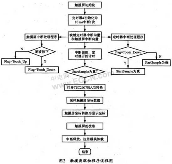 首先初始化触摸屏控制器,然后初始化脉宽调制计时器(PWM TIMER),可以选择计时器4为时钟,定义10 ms中断1次,以提供触摸屏采样时间基准,即10 ms触摸屏采样1次。而后映射触摸屏中断向量和定时器中断向量到响应程序,触摸屏中断处理程序是判断触摸屏是否被按下了,若触摸屏被按下,则给全局变量Flag_Trouch赋值为Touch_Down,否则赋值为Touch_Up。若计时器中断处理程序判断Flag_Touch被赋值为Touch_Down,则给全局变量StartSample置位,以控制触摸屏采样。然后系统通过S3C2440_get_xy()获得采样值,对得到的触摸屏的数据进行处理。接下来是对触摸屏的校准,最后是中断的释放和注册模块的卸载。其具体的触摸屏驱动工作流程图如图2所示。