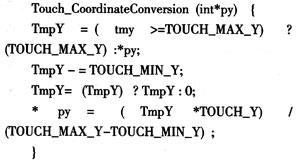 函数Touch_Coordinate Conversion完成触摸屏采样值转换成显示坐标,其中TOUCH_MAX_Y和TOUCH_MIN_Y是触摸屏X坐标采样值的最大和最小值;X坐标同理。若使用的是320×240的TFT屏,则Y坐标的转换程序如下: