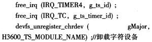 设计中通过调用s3c2440_ts_cleanup_module0来实现中断的释放和设备的卸载,分别将它们释放在初始化过程中,其申请的IRQ_TIMER4、IRQ_ADC_DONE、IRQ_TC的中断和字符设备的接口函数devfs_register_chrdev ()具体如下: