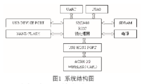 S3C2410处理器作为核心芯片集成了许多重要功能模块,本系统主要用到以下部分:NandFlash控制器、SDRAM控制器、3个通道的UART、2个USB主机接口、1个USB设备接口、JTAG。NandFlash作为存储器,用于存储支撑整个系统软件的BootLoader、Kernel、文件系统。在开发调试时串口作为控制台起作用,USB设备接口起到与PC机连接并下载传输数据的作用,而USB主机接口用于连接3G无线网卡设备,Embedded-ICE(20脚标准JTAG)接口和并口式JTAG接口则支挣ADS软件的下载、调试以及Flash的烧写。系统结构图如下: