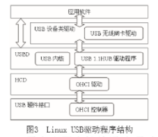 USB驱动程序分为主机控制器驱动程序(HostController Driver,HCD)、主机端设备驱动程序(USBD)和不同的USB设备的设备类驱动(Sla-ve Device Driver)。USB的HCD是USB主机驱动程序中直接与硬件交互的软件模块,USBD是整个USB主机驱动程序的核心,而USB设备类驱动则是最终与应用程序交互的软件模块。