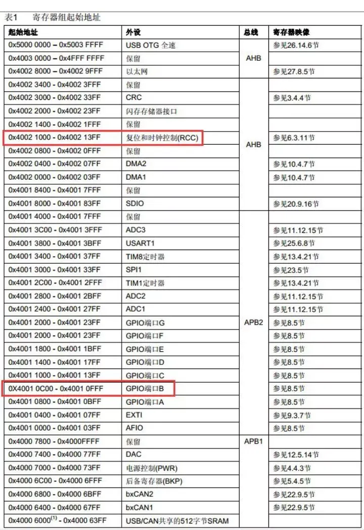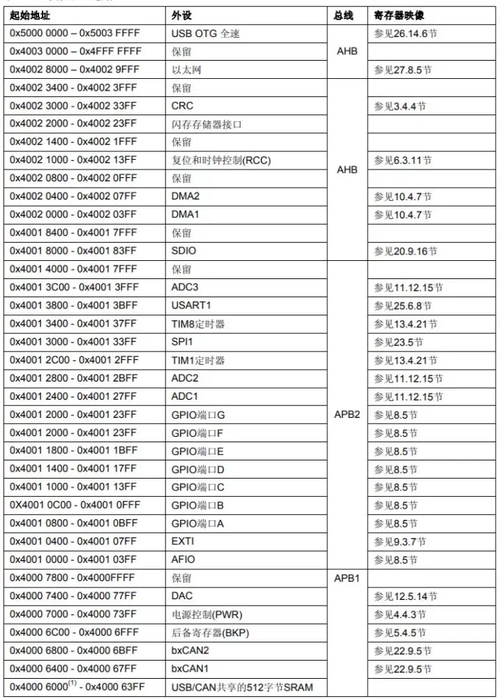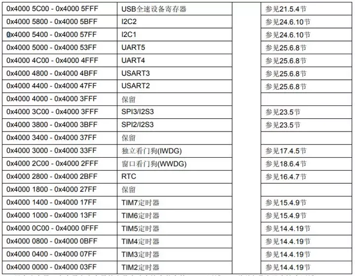 这三条总线的基地址我们是从《STM32 中文参考手册》2.3小节—存储器映像得到的:APB1的基地址是TIM2定时器的起始地址,APB2的基地址是AFIO的起始地址,AHB的基地址是SDIO的起始地址。其中APB1地址又叫做外设基地址,是所有外设的基地址,叫做PERIPH_BASE。