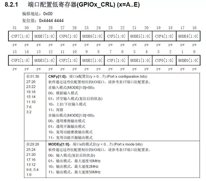 这个由端口配置寄存器来控制。端口配置寄存器分为高低两个,每4bit 控制一个IO 口,所以端口配置低寄存器:CRL 控制这IO 口的低8 位,端口配置高寄存器:CRH控制这IO 口的高8bit。