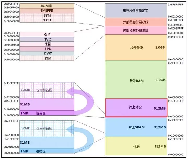 我们这里要讲的是片上外设,就是我们所说的寄存器的根据地,其大小总共有512MB,512MB是其极限空间,并不是每个单片机都用得完,实际上各个MCU厂商都只是用了一部分而已。STM32F1系列用到了:0x4000 0000 ~0x5003 FFFF。现在我们说的STM32的寄存器就是位于这个区域