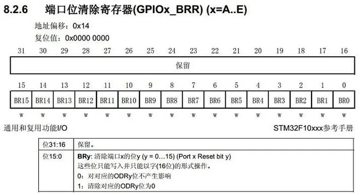 上面我们在控制GPIO输出内容的时候控制的是ODR(Output data register)寄存器,ODR是一个16位的寄存器,必须以字的形式控制其实我们还可以控制BSRR和BRR这两个寄存器来控制IO的电平,下面我们简单介绍下BRR寄存器的功能,BSRR自行看手册研究。