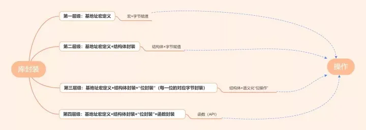 如图,达到第四层级便是我们所熟知的固件库或HAL库的效果。当然库的编写还需要考虑许多问题,不止于这些内容。我们需要的是了解库封装的大概过程。
