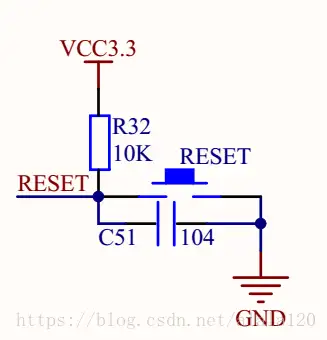 上电复位,在上电瞬间,电容充电,RESET出现短暂的低电平,该低电平持续时间由电阻和电容共同决定,需求的复位信号持续时间约在1ms左右,计算方式如下: