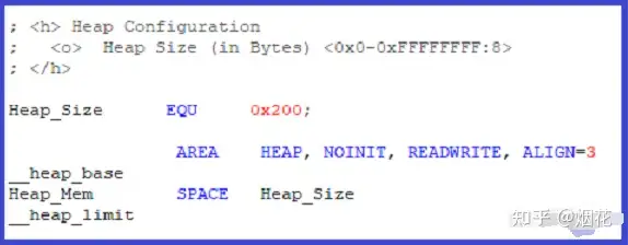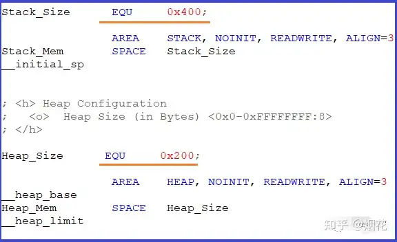 上面是基于栈空间大小的调整来解释启动文件里ZI数据的大小变化。如果说我们的代码里还用到堆,这时启动文件里的ZI数据就不仅仅是栈空间大小的数据了,还会包括堆空间的大小。比方,我们在代码里启用动态内存分配使用到堆。在启动文件里对堆、栈的配置如下: