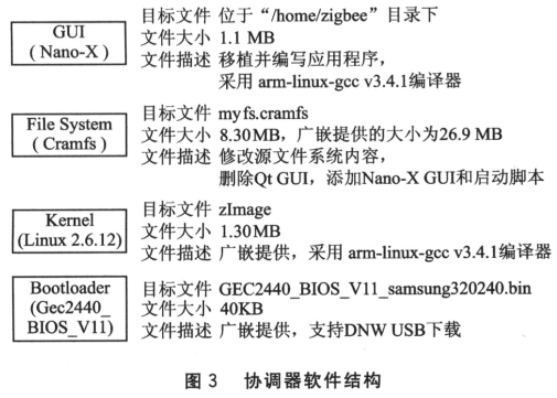 采用嵌入式Linux操作系统,在TI公司ZigBee协议栈基础上,在原Bootloader、Kernel上修改文件系统,添加GUI应用程序,并修改系统启动脚本使应用程序在系统启动时自运行。网络协调器的实现过程中使用多线程技术,串口数据收发、GUI显示与按钮响应、ZigBee节点掉线检测3 个线程并发,提高系统响应速度。软件结构如图3所示。