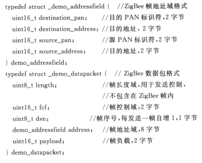 在RFD的设计中,ZigBee设备采用16位短地址,负载来自光敏电阻的采样电压值,为2字节,FCS由CC2420自动校验。所以,本设计中使用的帧长度为15字节。定义ZigBee帧的数据格式如下: