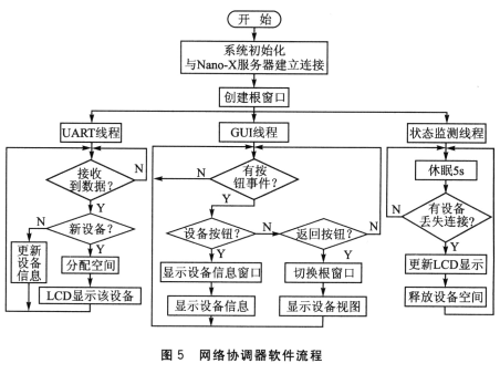 通过天线接收RFD传输过来的数据帧,经过CC2420自动校验。若无误则经过解码、译码,然后经过SPI接口送往ATmega128L,再经过串口UART1送往S3C2440,经数据处理后显示于相应的LCD触摸屏上。协调器软件流程如图5所示。