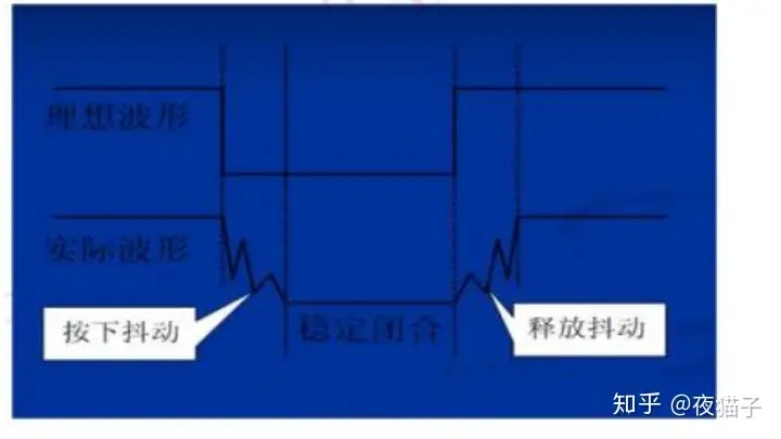 如图所示,按键闭合式不会立刻稳定的接通,断开时也不会一下子断开,会伴随一些抖动。抖动的时间长短有按键特性决定,一般为5Ms到10ms.按键抖动会引起按键被误读多次。为了确保 CPU 对按键的一次闭合仅作一次处理,必须进行消抖。