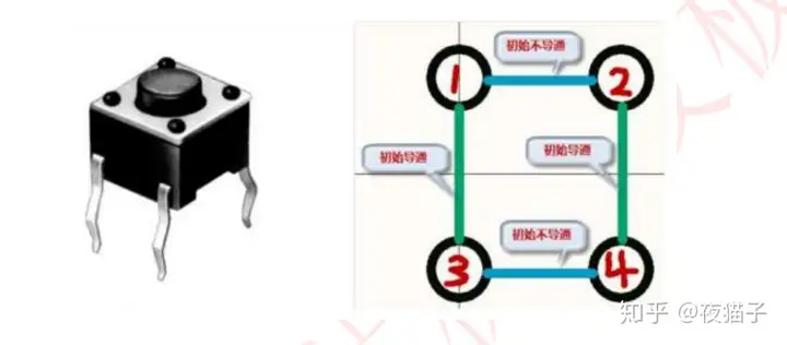 开关断开。我们开发板上使用的按键及内部简易图如下图所示
