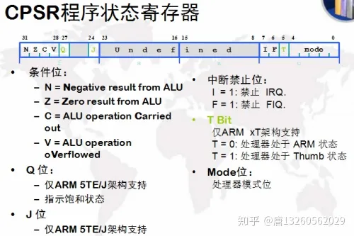 * 在ARM V5及以上的版本的E系列处理器中,Q标识位指示增强的DSP运算指令是否发生了溢出,在其它版本的处理器中,Q未定义。