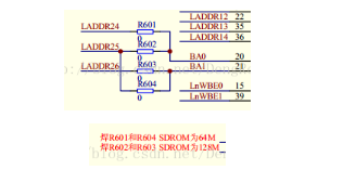 首先四字节对其寻址(32位数据线),那么DAT0 DAT1的寻址线肯定是0,所以没有接上的必要,24 25 26决定最高位,如果为64M r601 r604接上,地址线24-25连接,CPU设置0x30000000为基地址的话,最高地址是0x33FFFFFF,(0x30000000-0x33ffffff) = 0x3ffffff个字节,一共就是64M字节