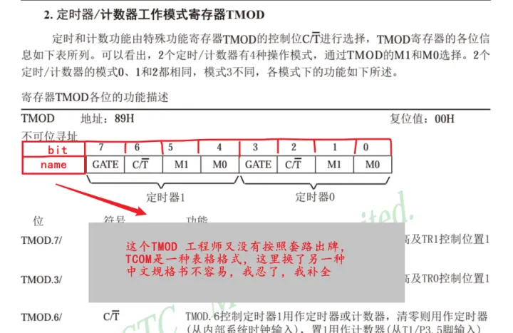 很多时候,我们写规格书的工程师,都是理科人才,理科人才俗成“一根筋”(非贬义,不是这种特质,太灵活而不严谨也做不好技术),他是以自己的智力来衡量大部分人的智力,也就是跳跃式思维写东西,我们看上面简单的寄存器TCON表格,实际上就是不友好的表示方式,SFR name TCON 实际上上面已经说明了这是寄存器TCON 表格里又出现它,增加脑力损耗,应删掉,Address 88H 地址是寄存器集中在一块,每个寄存器都会分配个地址,但是对我们编程来说,基本上不用管它,所以这个也可以不列在这里。然后bit name 又写的太省了,bit应该是位名称(或者称位序号), name应该是功能名称,所以我给他改改。