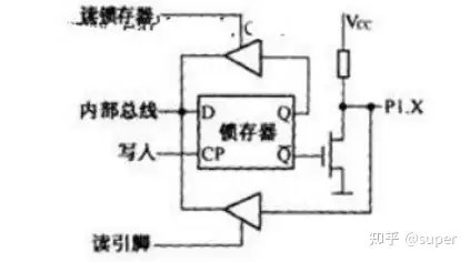 首先,给出单片机典型的I/O口,即P1口电气结构图,如图所示。P1口通常是作为通用I/O口使用,不需要多路转换电路MUX。其输出级电路内部有上拉电阻,与场效应管共同组成输出驱动电路。因此,P1口作为输出时,不需要再外接上拉电阻,而当P1口作为输入口使用时,仍然需要先向锁存器写“1”,截止场效应管。