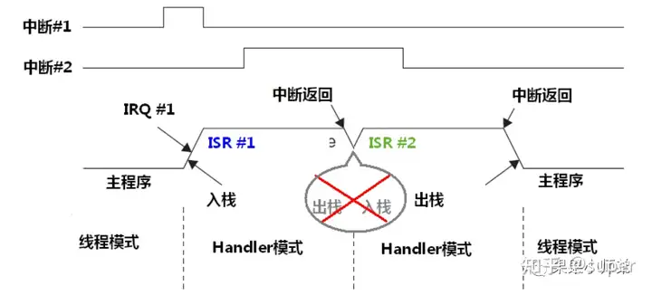 我们知道,在进入中断的时候需要执行入栈,而退出中断的时候需要执行出栈。那么当两个中断来临的时候,像这样在第一个中断执行完成之后,要执行第二个中断。在CM3 处理器内核中是不会再执行出栈和入栈的。也就是说这里节省了出栈和入栈的时间,实际上相当于第2个中断把第一个中断的尾巴咬掉。也就是没有让它再出栈,所以这就被称为咬尾中断。