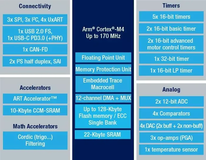 从官方STM32G431RB功能块图可以看出,G431的主要设备功能: