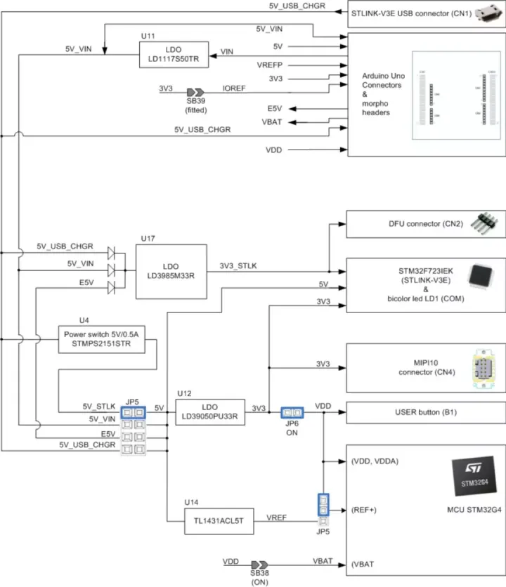 选择5V_STLIK供电时,供电路径分别经过 U4、JP5、U12和U14 然后到ST-LINK、MCU以及MIPI10接口。