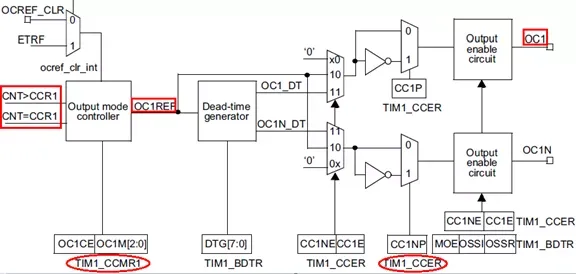 任一时刻计数器的值与CCR的比较结果,结合相应的比较输出模式决定了中间参考信号OC1REF的电平,而最终输出端OC1的输出电平取决于极性选择CC1P位的配置。即对于非互补输出时 Ocx =OCxREF + 极性 【+ 表示结合的意思】