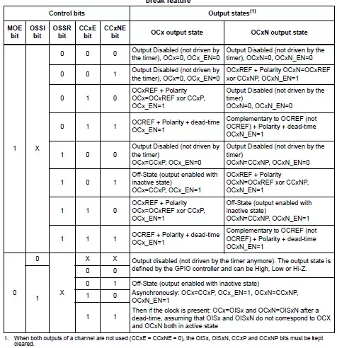 8. 对于高级定时器来说,Ocx/OCxN的输出除了跟输出使能位有关外,跟其它多个控制位【MOE/OSSI/OSSR/CCxP/CCxNP】有关。各个系列的STM32参考手册中有个Ocx/OcxN互补通道输出控制表格可以查看。