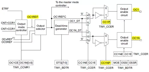 该OCxREF源于输出模式控制器,并硬件约定高电平为有效信号,即有效状态所对应的信号。它经过极性选择后,再经过输出控制电路输出到管脚。当极性选择位CCxP=0时,高电平作为Ocx的有效输出信号,当CCxP=1时,低电平作为Ocx的有效输出。