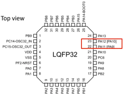 PA10和PA9分别可以重映射PA12和PA11这两个GPIO口,为那些在封装上没有提供这些引脚但又想访问它们的引脚功能提供了可能,通过SYS_CFG寄存器重映射。