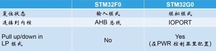 G0的GPIO模块与F0的类似,主要有以下区别