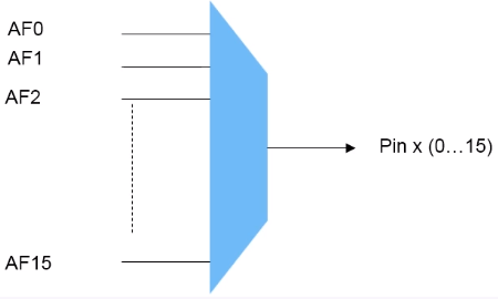 复用功能多路选择器选择连接到I/O引脚的外设,一次只有一个复用功能连接到特定的I/O引脚,通过GPIOx _AFRL和GPIOx_AFRH寄存器配置。