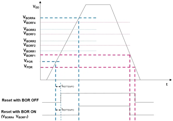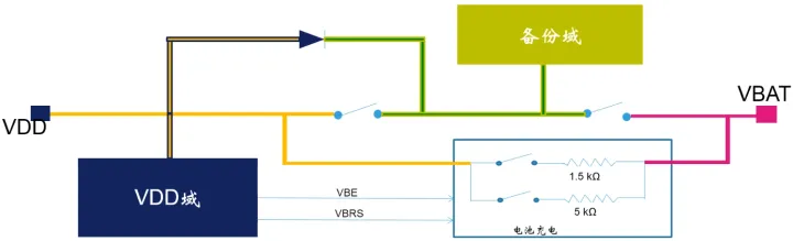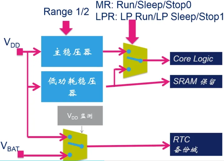 Stop里面也根据有哪些外设是可以使用的、哪些外设不可以使用分为stop 0、stop 1、stop 2,在L4里有stop 2模式,在STM32里stop 2的功耗 PVD和BOR是做电压的检测,BOR是欠压检测,欠压检测就是如果没达到阈值电压的时候,是不能上电的,不能reset;掉电的时候也是这样,掉到阈值电压以下就reset,这是让整个系统更加稳定的功能。PVD就是可编程电压的检测器,可编程的电压不会产生reset,它是产生一个中断,另外可编程就意味着阈值电压是可以遍进去的,所以这是一个比较方便的外设。在L4中,下降和上升阈值必须一起配置,而在G0中,下降和上升阈值可以各自配置。 BOR和PDR周期采样是在G0中才存在的功能。 电源设计 从电源设计的角度,我们看任何一个MCU,都要看它的电源是怎么设计的,尤其是低功耗的时候电源也很重要。 对于这个电源来说,进来的电是VDD,VDD进来之后一部分给数字供电,一部分给模拟供电 ,数字部分给数字外设供电,外设供电之后数字有一部分通过电压调节器分出来内核的电压,内核的电压是可以去调节的,其实电压调节器也分好几种——主电压调节器、低功耗电压调节器,不同的电压调节器本质上是说输出给内核的电压是不同的,有可能全输的时候是1.2V的,有可能半输的时候是1.0V的,也有可能低功耗的时候比1.0V还低,电压和整个MCU跑的频率是成正比的,电压越大,MCU整个主频跑的越快;电压越低,主频越小。数字部分还有standby电路的电压,有一个备份域,我们可以看到VBAT,这个的意思就是说可以接电池去给它供电,如果整个系统VDD是有电的话,那就自动通过VDD来供电,当系统的VDD没有电了,这时候有电池,VBAT这个引脚接了电池,就转为电池供电。 G0的模拟比较好的是它有一个VREF buffer,这个buffer的意思是它提供两个内部的参考电压源,这两个参考电压源很精准,一个是2.5V,一个2.48V,可以用做内部模拟器件的参考电压,而且还可以输出用做外部的参考电压。 VDD供电范围是1.7V~3.6V(最低可1.6V,低于该值则会产生Power-down),在存在其他独立电源供电时,VDD必须提供。 VDD供电范围是1.62~3.6V,当使用ADC或COMP时,VDDA的最小供电电压为1.62V;当使用DAC时,VDDA的最小供电电压为1.8V;当时用VREFBUF时,VDDA的最小供电电压为2.4V。 当VDDA<2V时,VREF+=VDDA;当VDDA>2V时,2V VREF+:ADC和DAC的参考电压,该电压可以由外部参考电压或者内部的电压参考buffer提供,在低引脚数量的封装上不提供VREF+引脚和内部参考电压,此时VREF+与VDDA内部连接到VDD,内部电压参考buffer保持禁用状态。 电源稳压器 对于GO来说,稳压器是由两个部分组成的,一个是主稳压器,另一个是低功耗稳压器。 主稳压器有2个电压范围(Range 1:1.2V,Range 2:1.0V),用于状态电压调整,用在RUN、Sleep和stop 0模式下。 低功耗稳压器用在LP Run、LP Sleep和带SRAM内容保留的stop 1模式。 G0的不同功耗模式 低功耗模式状态机 主要特性 7种低功耗模式带快速唤醒,低至33nA(Shutdown)仍可用I/O唤醒,低至870nA(standby)仍可有36KB RAM保留能力,很多种外设可以从低功耗模式下唤醒MCU。 在运行模式下低至98.3µA/MHz。 VBAT模式依旧可以保持RTC和备份寄存器的内容。 运用优势 高度灵活度使用户可以选择多个低功耗模式,这取决于需要激活哪些外设,性能要求以唤醒源。 增加了电池使用寿命。 由于只有一对VDD/VSS电源对,从而降低了BOM成本。 RUN和LP RUN模式 每一个外设的时钟可以配置为开启ON或关闭OFF,复位后,除了FLASH所有的外设时钟都是关闭的;在RUN模式下,SRAM时钟总是ON开启的。 当从SRAM启动(在RUN或LP RUN 模式下),FLASH闪存可以处于Power-down模式(仅限Low-Power run);FLASH闪存时钟可以关闭;中断向量必须被重映射到SRAM。 Sleep和LP Sleep模式 内核停止,每个外设的时钟可以被打开或关闭。 通过执行WFI(等待中断)或WFE(等待事件)进入该模式。 2种机制进入该模式:Sleep Now:一旦执行了WFI/WFE事件后,MCU就立刻进入Sleep模式; Sleep on Exit:一旦退出了最低优先级ISR,MCU就立刻进入Sleep模式,在进入Sleep模式前,栈没有被弹出,在下个中断产生时也不会被压栈,节省运行时间。 由内核Cortex-M0+系统控制寄存器[SLEEPONEXIT]。 Sleep模式:Range 1 LP Sleep Stop模式 SRAM和所有的外设寄存器保留。 所有的高速时钟停止。 LSE(32.768KHz外部时钟)和LSI(32KHz内部时钟)可以使能。 一些外设能够被激活并且用于从stop模式唤醒。 系统时钟唤醒后是HSI16(2µs唤醒时钟从SRAM启动,5.6µs从FLASH启动)。 Stop 1和stop 2在主稳压器关闭的情况下是等同的,会有一个更小的功耗但是更长的唤醒时间。 Stop 0模式 Stop 1模式 Stop模式对比 Stop 0和stop 1模式最明显的区别就是稳压器不同,也就导致两种模式的功耗有很大区别。 Standby模式 SRAM和寄存器内容默认不会保存(电源稳压器为关闭),但20字节备份寄存器总是保存的。 可以设置为保存36K字节SRAM的内容(默认不保留SRAM的内容,但可配置)。 超低功耗BOR/PDR配置:忽略下降VDD斜率,采用ULP模式周期性监控VDD电压从而降低功耗。 每个I/O口可配置为上拉/下拉,利用PWR_PUCRx/PWR_PDCRx寄存器(x=A,B,……H),当PWR_CR3寄存器中的APC=1时,允许去控制外部器件的输入状态。 唤醒引脚:每个唤醒引脚的极性可配置。 唤醒时钟是HSI16为16MHz。 Standby模式下带SRAM Standby模式不带SRAM Shutdown模式 Shutdown模式和standby模式类似,但是没有电源监控,即没有BOR和PDR,供电不能切换到VBAT,如果电压的供电低于1.6V产品的状态不能得到保证,并不能自动切换到VBAT; 没有LSI,没有IWDG