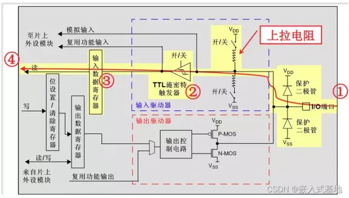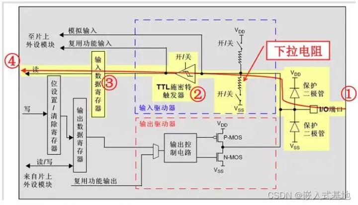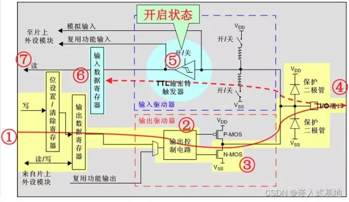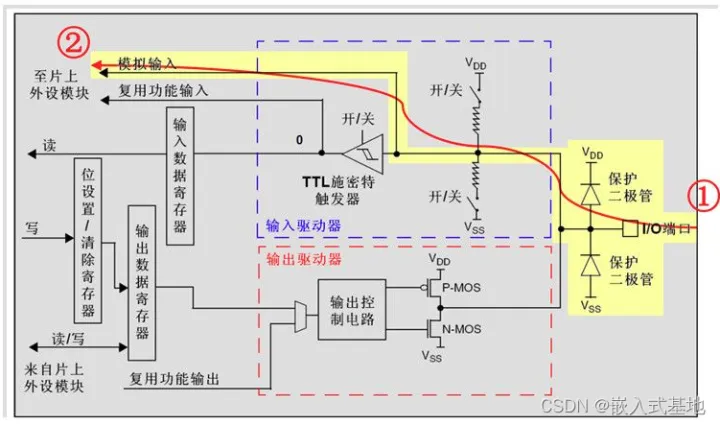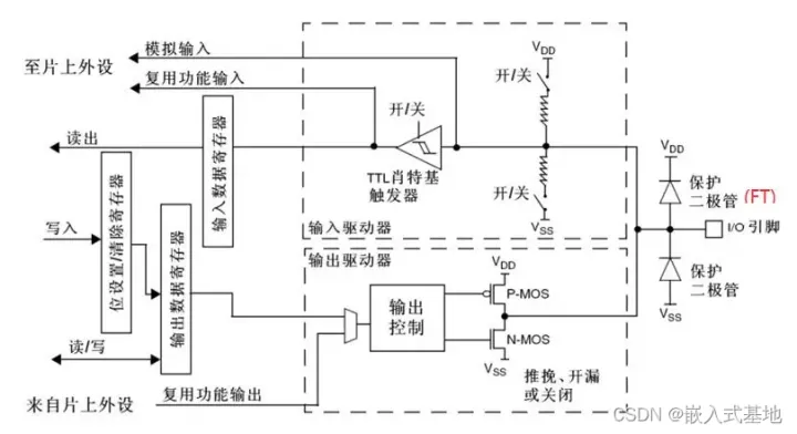 每个GPIO内部都有这样的一个电路结构,这个结构在本文下面会具体介绍。