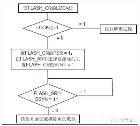 <3>. 闪存的擦除 闪存编程的时候,要先判断其写入地址的FLASH是被擦除了的(也就是其值必须是0xFFFF),否则无法写入。闪存擦除分为页擦除和整片擦除。 闪存页擦除过程如下图示: