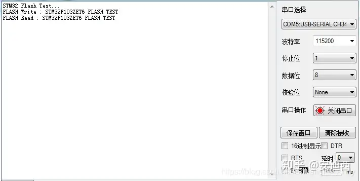 for(i=0;i WriteAddr+=2; //一个地址对应8bits,写入半字,所以地址加2 } } #define STM_SECTOR_SIZE 2048 //大容量STM32的扇区大小为2K字节 uint16_t STMFLASH_BUF[STM_SECTOR_SIZE/2]; void STMFLASH_Write(uint32_t WriteAddr,uint16_t *pBuffer,uint16_t NumToWrite){ uint32_t secpos; //扇区地址 uint16_t secoff; //扇区内偏移地址 uint16_t secremain; //扇区内剩余地址 uint16_t i; uint32_t offaddr; //去掉0x08000000后的地址 if(WriteAddr return; //判断地址是否非法 HAL_FLASH_Unlock(); //解锁 offaddr=WriteAddr-STM32_FLASH_BASE; //实际偏移地址 secpos=offaddr/STM_SECTOR_SIZE; //扇区地址 secoff=(offaddr%STM_SECTOR_SIZE)/2; //扇区内的偏移 secremain=STM_SECTOR_SIZE/2-secoff; //扇区剩余空间大小 if(NumToWrite<=secremain) secremain=NumToWrite; //小于或等于扇区范围 while(1){ STMFLASH_Read(secpos*STM_SECTOR_SIZE+STM32_FLASH_BASE,STMFLASH_BUF,STM_SECTOR_SIZE/2); //读出整个扇区的内容 for(i=0;i } if(i FLASH_WaitForLastOperation(FLASH_WAITETIME); //等待上次操作完成 CLEAR_BIT(FLASH->CR, FLASH_CR_PER); //清除CR寄存器的PER位 for(i=0;i } STMFLASH_Write_NoCheck(secpos*STM_SECTOR_SIZE+STM32_FLASH_BASE,STMFLASH_BUF,STM_SECTOR_SIZE/2); //写入整个扇区 }else{ FLASH_WaitForLastOperation(FLASH_WAITETIME); //等待上次操作完成 STMFLASH_Write_NoCheck(WriteAddr,pBuffer,secremain); //写已经擦除了的,直接写入扇区剩余区间 } if(NumToWrite==secremain) break; //写入结束了 else{ //写入未结束 secpos++; //扇区地址加1 secoff=0; //偏移位置为0 pBuffer+=secremain; //指针偏移 WriteAddr+=secremain*2; //写地址偏移 NumToWrite-=secremain; //字节数递减 if(NumToWrite>(STM_SECTOR_SIZE/2)) secremain=STM_SECTOR_SIZE/2; //下一个扇区还是写不完 else secremain=NumToWrite; //下一个扇区可以写完了 } }; HAL_FLASH_Lock(); //上锁 } void STMFLASH_Read(uint32_t ReadAddr,uint16_t *pBuffer,uint16_t NumToRead){ uint16_t i; for(i=0;i ReadAddr+=2; //偏移2个字节 } } 在main.c文件下编写STM32 flash测试代码 /* USER CODE BEGIN PV */ const uint8_t Text_Buf[] = {"STM32F103ZET6 FLASH TEST"}; #define TEXTSIZE sizeof(Text_Buf) #define FLASH_SAVE_ADDR 0x08070000 //设置FLASH保存地址(要大于FLASH起始地址) /* USER CODE END PV */ void SystemClock_Config(void); int main(void){ /* USER CODE BEGIN 1 */ uint8_t key; uint8_t Read_Buf[TEXTSIZE]; /* USER CODE END 1 */ HAL_Init(); SystemClock_Config(); MX_GPIO_Init(); MX_USART1_UART_Init(); /* USER CODE BEGIN 2 */ printf("STM32 Flash Test...rn"); /* USER CODE END 2 */ while (1){ key = KEY_Scan(0); if(key == KEY_UP_PRES){ STMFLASH_Write(FLASH_SAVE_ADDR,(uint16_t *)Text_Buf,TEXTSIZE); printf("FLASH Write : %srn",Text_Buf); } if(key == KEY_DOWN_PRES){ STMFLASH_Read(FLASH_SAVE_ADDR,(uint16_t *)Read_Buf,TEXTSIZE); printf("FLASH Read : %srn",Read_Buf); } HAL_GPIO_TogglePin(GPIOC,GPIO_PIN_0); HAL_Delay(200); } } 编译无误下载到开发板后,可以看到D1指示灯不断闪烁,当按下K_UP按键后数据写入到FLASH内,当按下K_DOWN按键后将写入的数据读取出来,同时串口打印出相应信息4. 下载验证