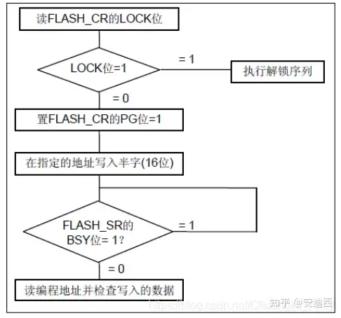 其中FPEC键寄存器共有3中键值: PDPRT=0x000000A5; KEY1=0x45670123; KEY2=0xCDEF89AB STM32复位后,FPEC模块是被保护的,不能写入FLASH_CR寄存器;通过写入特定的序列到FLASH_KEYR寄存器可以打开FPEC模块(即写入KEY1和KEY2),只有在写保护被解除后,才能操作相关寄存器。 闪存编程过程如下图所示: