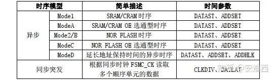 FSMC的NOR Flash控制器支持同步和异步突发两种访问方式,选用不同的时序模型时,需要设置不同的时序参数: