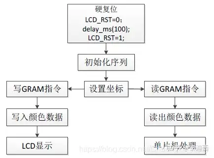任何LCD的使用流程都可以简单的用以下流程图来表示,其中硬复位和初始化序列只需要执行一次即可。画点流程:设置坐标 --> 写GRAM指令 --> 写入颜色数据,然后在LCD上就可以看到对应的点显示写入的颜色了;读点流程:设置坐标 --> 读GRAM指令 --> 读取颜色数据,这样就可以获取到对应点的颜色数据了
