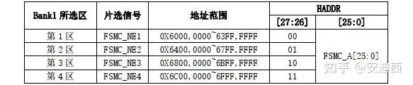 这里使用的是Bank1,Bank1又被分为4个区,每个区管理64MB空间,每个区都有独立的寄存器对所连接的存储器进行配置。Bank1的256MB空间由28根地址线(HADDR[27:0])寻址,HADDR是内部AHB地址总线,其中HADDR[25:0]来自外部存储器地址FSMC_A[25:0],HADDR[27:26]用于对4个区寻址: