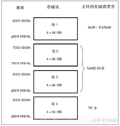 下面介绍一下FSMC的外部设备地址映射,从FSMC的角度外部存储器被划分为4个固定大小的存储区域(Bank),每个存储区域的大小为256MB,共1GB空间,详见下图: